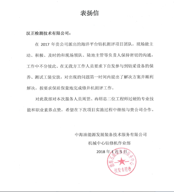 2018年1月5日我公司收到中海油能源发展装备公司发来的表扬信,对我公司测评团队过硬的专业技能和职业素养给予充分肯定和表扬。