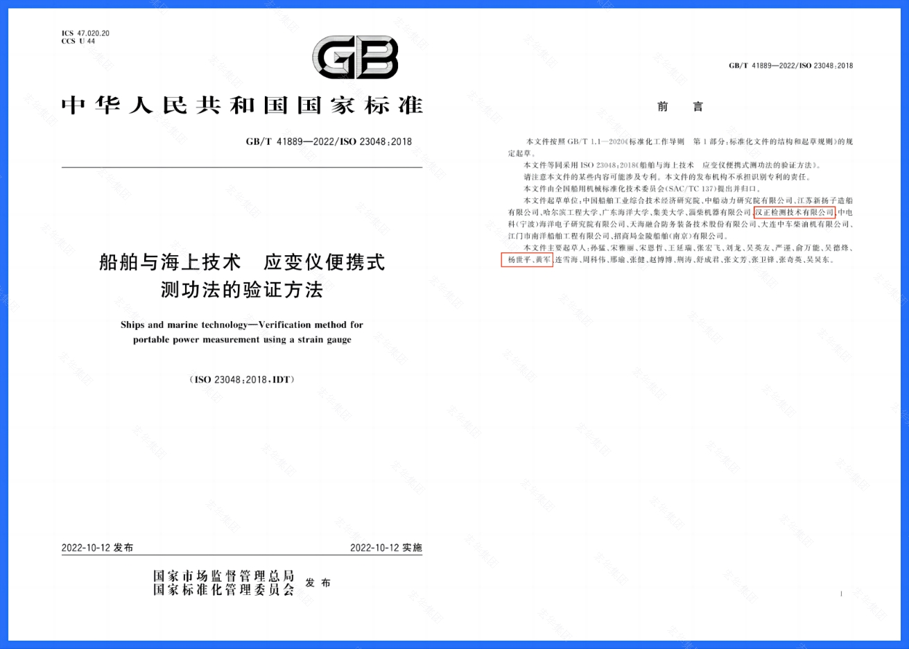 近日,汉正检测董事长/总经理杨世平、总工程师黄军作为主要起草人编制的国家标准《船舶与海上技术 应变仪便携式测功法的验证方法》(GB/T 41889-2022)由国家市场监督管理总局、国家标准化管理委员会正式颁布。该标准于2022年10月12日起实施。