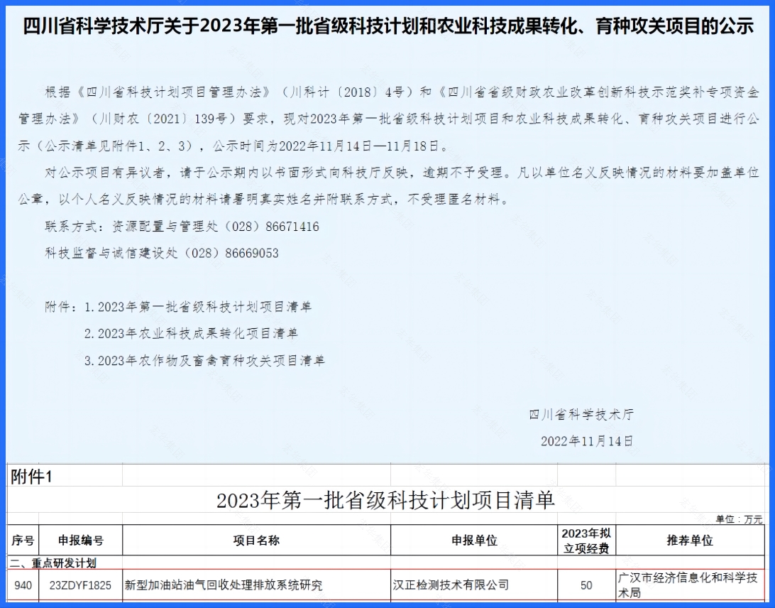 2022年11月14日,根据四川省科技厅官方网站公告文件,我公司“新型加油站油气回收处理排放系统研究项目”被列入“2023年第一批省级科技计划项目”重点研发计划。该项目的研发实施将助推国家“精准治污、科学治污、依法治污”方针政策的落地,有效的减少VOCs排放,为保护环境做出积极贡献。