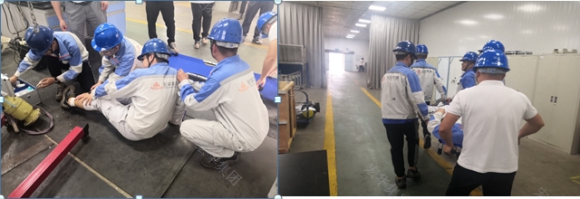 本次演练模拟在汉正检测工业设备所安全阀校验区,校验人员搬运安全阀时,手滑脱落下砸,造成工作人员脚踝受伤。事故发生后,立即启动HZT-ZD17-2021 《应急处理预案》,展开救援抢救工作,应急救援指挥组协调指挥全局,负责组织救援队伍到现场实施救援。事故现场,指挥协调得当,各部门配合密切,医疗救护组立即对砸伤人员进行包扎止血并扶上担架送往医院救治。
