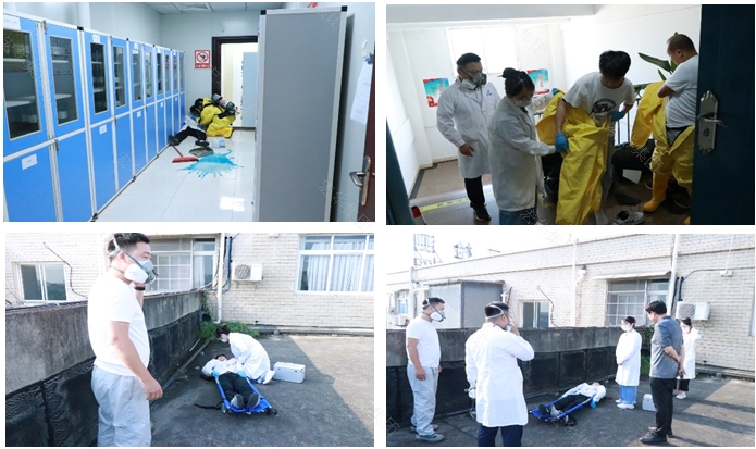 上午8点30分,救援警报声响起,三氯甲烷泄漏应急演练正式开始。医疗救护组人员穿好防护服、戴好防毒面具,快速进入现场进行救援和处置,通讯联络组紧急与120联系,警戒疏散组立即到各楼层疏散人员,整个演练过程秩序井然。