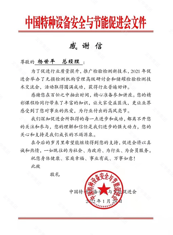 此外公司还收到了来自中国特种设备安全与节能促进会的感谢信,公司董事长兼总经理杨世平结合多年工作经验,提炼管理精华,分享先进检验技术,获得行业深度好评,标志着汉正检测在多元化发展道路上迈出新的步伐。