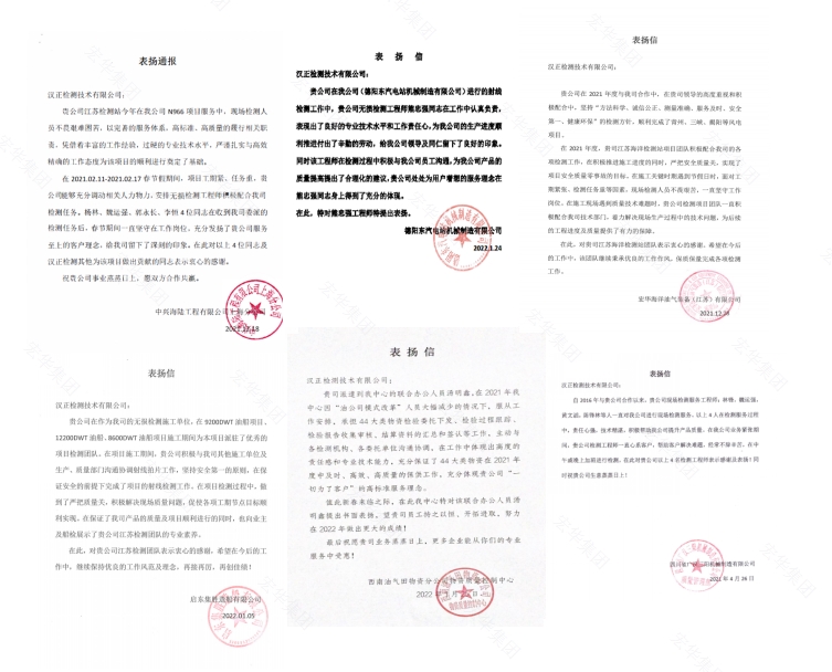 2022悄然来临,至此新春佳节之际,汉正检测收到了海洋项目、东汽电站项目、风电项目等纷纷投来的表扬信。一封封表扬信,包含着浓浓的激励情,表达了对汉正人工作的肯定与感谢。在这些项目开展期间,大部分都是工期短、任务重、要求严,常常还会面临作业平台没有信号、工作环境恶劣、生活条件乏味的问题,但汉正检测的工程师们总是舍小家为大家,攻坚克难,以完善的服务体系、高标准、高质量的履行相关职责,凭借丰富的工作经验和过硬的专业技术水平,严谨扎实、高效精准的圆满完成检测任务,用行动、用实力获得客户的认可。