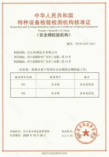 汉正检测于2021年10月21日喜获由四川省市场监督管理局颁发的“安全阀校验机构”第一次换证资格证书。