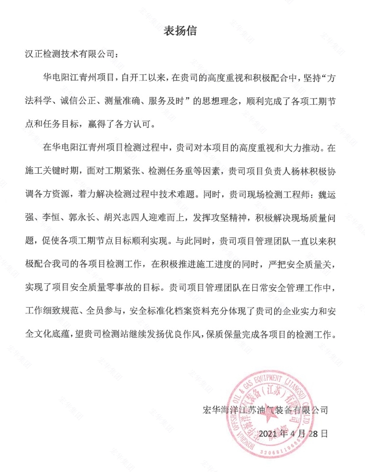 作为宏华的一分子,同时作为独立的第三方检测机构,汉正检测团队坚持不懈地抓好产品质量和服务质量,全力配合生产进度,切实为四川宏华海上风电项目的顺利交付保驾护航!(图/文 汉正检测市场部 杨林)