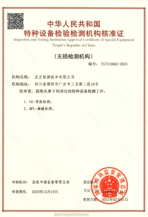 2021年2月7日,四川宏华汉正检测获得国家市场监督管理总局颁发的“无损检测MFL机构资质”证书。