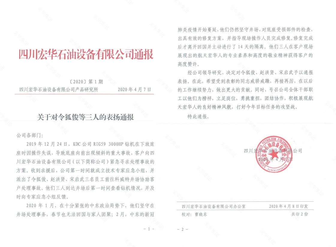 仪式上,高彦华、黄军分别介绍赵洪贤先进事迹、宣读四川宏华石油设备有限公司表扬通报及汉正检测技术有限公司授予赵洪贤“服务之星”的表彰决定。