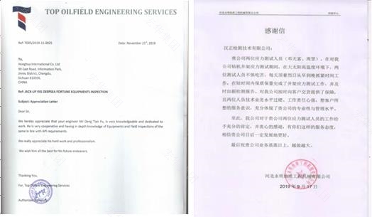 2019年8月,在河北钻机应力测试项目中,客户交货十分紧急,若不能在规定时间内交货,客户将面临高额的违约金。邓天富、周罡两位检测工程师想客户之所想,急客户之所急,不怕苦,不怕累,他们面对酷暑季节的恶劣气候,应变计安装接线高空作业以及工期紧迫等困难,每日早出晚归、主动加班加点,想方设法在保证检测质量的情况下加快检测进度,仅用3天时间就全面完成了井架应力测试,并及时出具检测报告,为客户准时交货提供了保障。随后,客户发来表扬信对两位工程师的工作态度和敬业精神给予了充分的肯定。