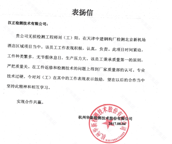 2017年,刘阳受公司委派参与北京大兴国际机场网状钢结构无损检测、残余应力测试工作。他不仅克服了时间紧迫,工件种类繁多,无节假休息日,生产压力大等困难,还克服了炎热天气,在那里一干就是四个月,无法照顾年幼儿子的困难,他始终坚持公司“方法科学、诚信公正、测量准确、服务及时”的质量方针,严把检测质量关,把客户的需求放在首位,以其认真负责的敬业精神,表现出的过硬专业技术,赢得了客户的书面表扬,也为首都新机场空港网状钢结构整体安全做出了积极努力。