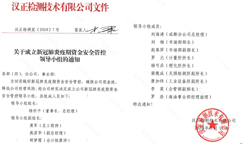 高彦华宣读了《关于成立新冠肺炎疫期资金安全管控领导小组》的通知(汉正检测发〔2020〕7号),明确了领导小组人员相关职责,同时对资金管控的后续工作进行了安排。