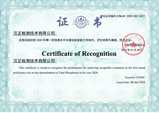 汉正检测获检验检测机构(CMA)及中国环境监测总站举行的能力验证证书