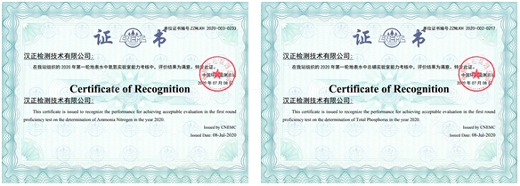 汉正检测获检验检测机构(CMA)及中国环境监测总站举行的能力验证证书。